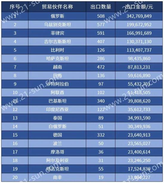 从金额上看,对巴基斯坦出口1110万美元仅能排到第五位,排在其前面的依次为俄罗斯、菲律宾、巴西和乌兹别克斯坦。其中,对俄罗斯出口金额高达6542万美元,几乎相当于2~4名之和。
