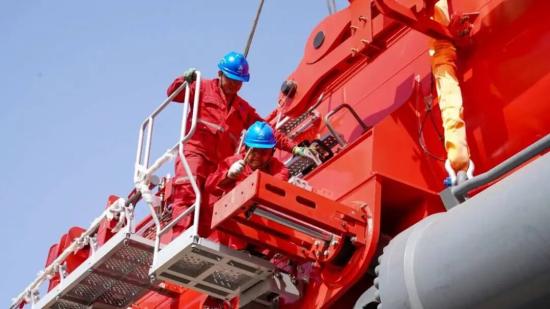 此次吊装的单机容量10MW风机,轮毂中心高度130米,机舱重量187.6吨,含吊具总重205吨。青岛君盛操作手刘彬师傅介绍说:“这是力量与精度之间的连接,它要做的,不是简单的‘吊起来’,而是在百米高空,完成一次‘穿针引线’——将机舱底部密密麻麻的螺栓孔,与塔筒顶端同样密集的螺栓进行精准对位,这需要的不只是配合,更是对经验和车辆的操控性能的考验。”