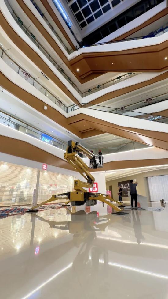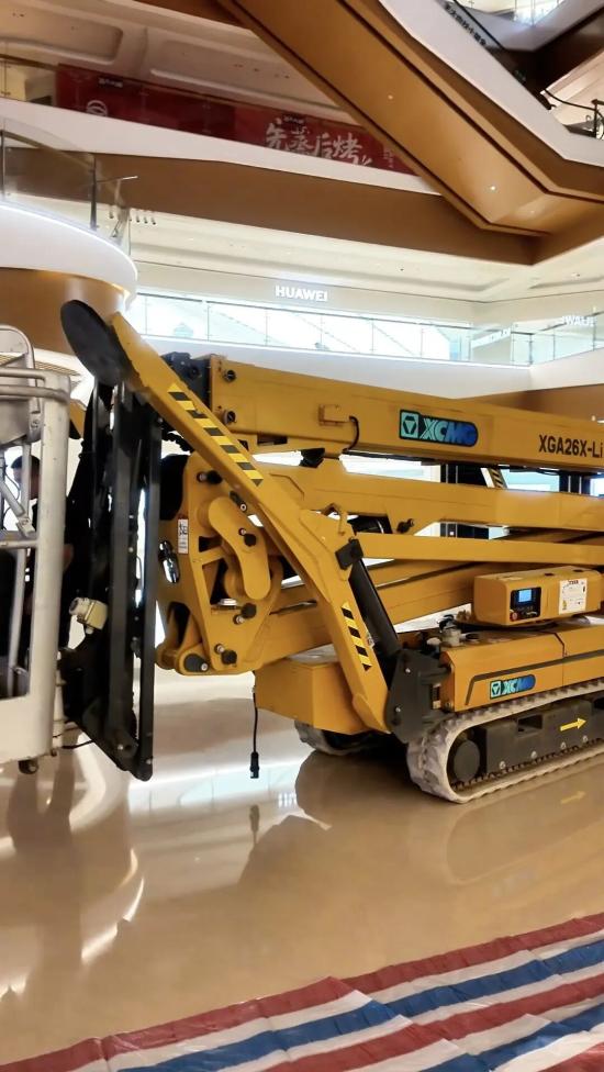 走进杭州某大型商场,只见徐工XGA26X-Li将四只“蜘蛛腿”稳稳“扎根”在商场中庭,正在向玻璃围栏下方的墙壁伸展臂架。