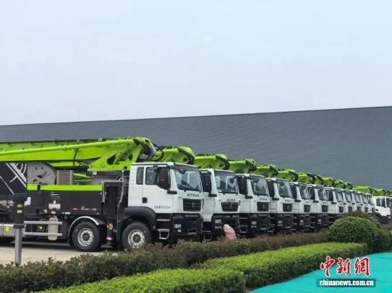 ▲园区停放的臂架泵车。中新网记者 鲁毅 摄