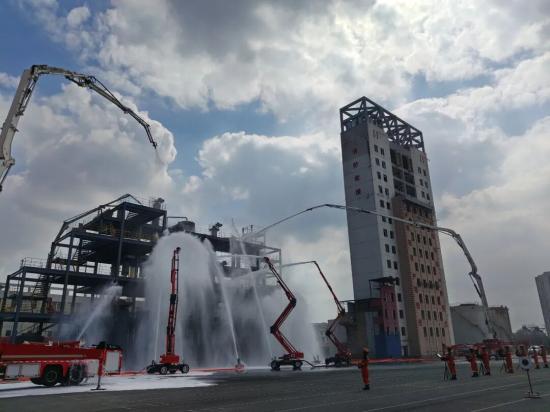 在绍兴,浙江省首届应急救援力量大比武暨新装备演示活动成功举办。化工装置火灾实战化演示现场,浓烟滚滚,火势汹涌,多台徐工轮式举高消防机器人与各类灭火装备协同作战,瞄准起火点展开多点攻击,有效控制火势蔓延。