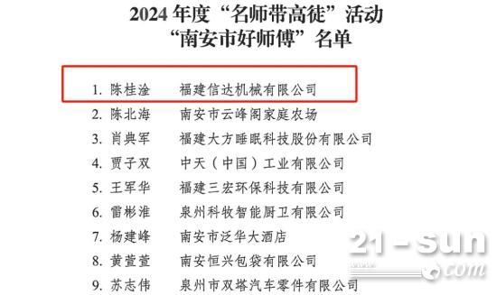 近日,南安市总工会正式印发《关于确认 2024 年度 “名师带高徒” 活动 “南安市好师傅” 的通知》(南工〔2025〕33 号),经过严格遴选与综合评定,福建信达机械有限公司陈桂淦同志凭借精湛的专业技艺、扎实的岗位担当及突出的传帮带成效,成功入选 2024 年度 “南安市好师傅” 名单,这既是对陈桂淦同志个人职业素养的高度认可,更是南安市总工会对我司产业工人队伍建设与技能人才培育工作的充分肯定。