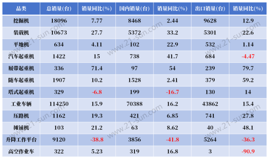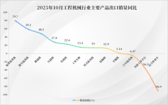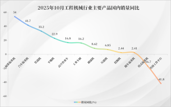 据中国工程机械工业协会最新统计数据显示,10月份行业整体呈现稳健增长态势。挖掘机、装载机作为行业两大主力产品,分别实现了7.77%和27.7%的同比增长,履带起重机销量同比激增71.4%,摊铺机延续稳健态势,增幅超20%;塔式起重机、升降工作平台持续承压,仍处下滑态势。