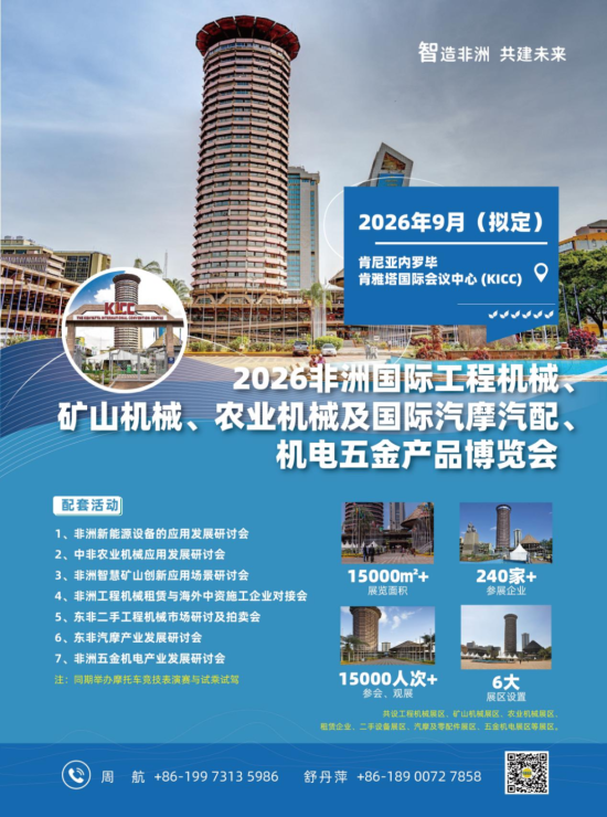 在非洲工业化浪潮与基础设施建设暴发的历史性机遇面前,一场汇聚全球产业力量、聚焦非洲未来发展的国际级行业盛会——“2026非洲国际工程机械、矿山机械、农业机械及国际汽摩汽配、机电五金产品博览会”,拟定于2026年9月在肯尼亚内罗毕肯雅塔国际会议中心(KICC) 隆重举行!