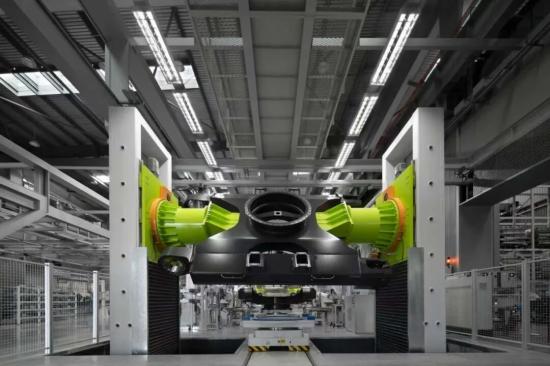 参观装配车间的第一步是“抬头看”——钢板拼成结构件之后,通过空中物流运至这个车间,不仅节省人力,还可以避免人工搬运造成的漆面损伤。