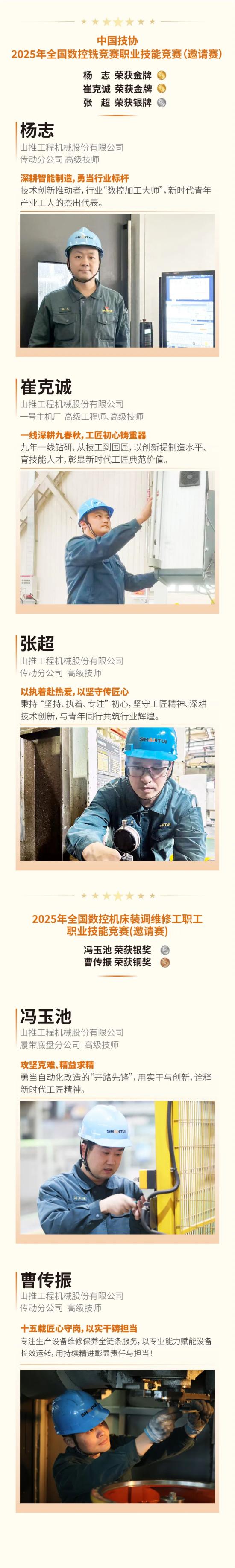 12月1日,由中国职工技术协会、山东省总工会联合主办的2025 年全国数控铣职业技能竞赛(邀请赛)在山东烟台圆满落幕。山东重工旗下山推选派的杨志、崔克诚双双摘金,张超斩获银奖,以精湛技艺在国家级技能舞台上为企业赢得荣誉。