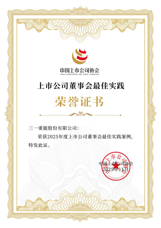 此外,在中国上市公司协会最新发布的“2025上市公司董事会最佳实践案例”评选中,三一重能凭借健全的董事会运作机制、科学的战略决策与风险监督体系,成功入选“最佳实践案例”。
