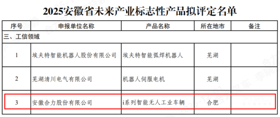 近期,安徽省工信厅对2025年安徽省未来产业标志性产品拟评定名单进行了公示,安徽合力股份有限公司(以下简称“合力”)申报的产品“i系列智能无人工业车辆”成功入选。