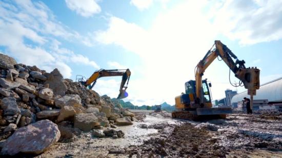 将蓝图刻于群山之巅,首战便是向山峦要平地。项目选址地势陡峭,土石方工程量大、精度要求高。这要求施工设备必须拥有撼山动地的磅礴力量和举重若轻的精准控制。