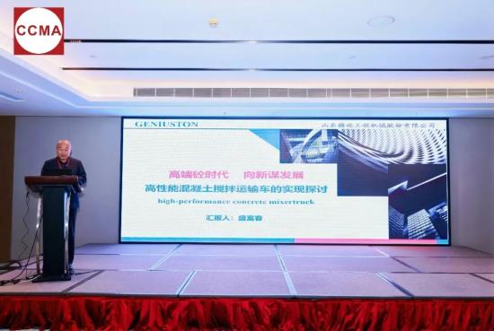 山东精砼工程机械股份有限公司董事长、协会专家委员会委员盛富春作《高端砼时代 向新谋发展——高性能混凝土搅拌运输车的实现探讨》主题报告