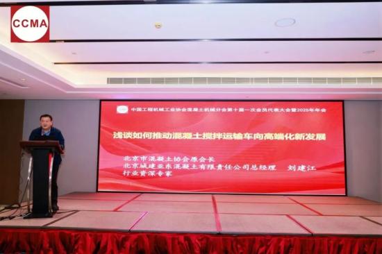 北京市混凝土协会原会长、北京城建亚东混凝土有限责任公司总经理刘建江作《浅谈如何推动混凝土搅拌运输车向高端化新发展》主题报告