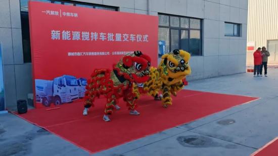 中集车辆DTB·搅拌车业务集团再传捷报,中集车辆&一汽解放新能源搅拌车批量交付仪式圆满举行,车辆披红戴花、整齐列阵,正式交付济南头部引领性商砼企业,为当地绿色工程运输注入强劲动能。