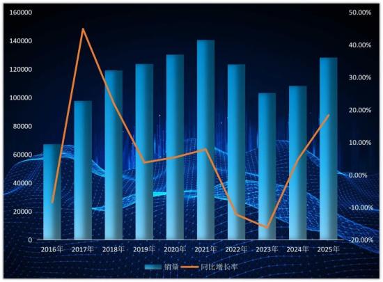 2025全年,装载机累计销量高达12.8万台,达到过去10年里的第三高(仅次于2021年的14万台和2020的13万台),同比18.35%的增速则为近七年新高。