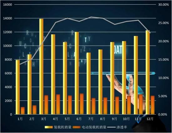 12月份,电动装载机共计销售2722台,同比增速高达218.7%,年内仅次于3月份的308.5%!不过,由于12月份行业出口销量猛增,而电动装载机主要市场在国内,因此整体渗透率反而下滑至22.25%,为四月份以来的最低。