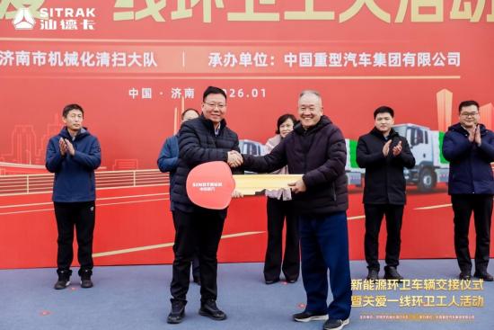 2026年1月14日,“新能源环卫车辆交接仪式暨关爱一线环卫工人活动”在济南机械化清扫大队隆重举行。活动现场完成37辆中国重汽汕德卡新能源环卫车辆交付,并同步开展关爱一线环卫工人暖心行动,政企携手开启济南环卫事业绿色转型新篇章。