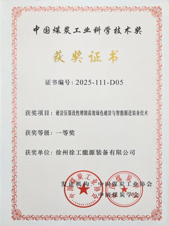 依托创新实力与完善的产品全生命周期开发流程,徐工能源联合中国矿业大学,潜心攻关的“硬岩压裂改性增割高效绿色破岩与智能掘进装备技术”项目斩获2025年度中国煤炭工业科学技术奖一等奖!此次获奖,不仅是对项目技术含量的权威认证,更标志着徐工能源在硬岩巷道智能掘进领域已跻身行业领先行列。