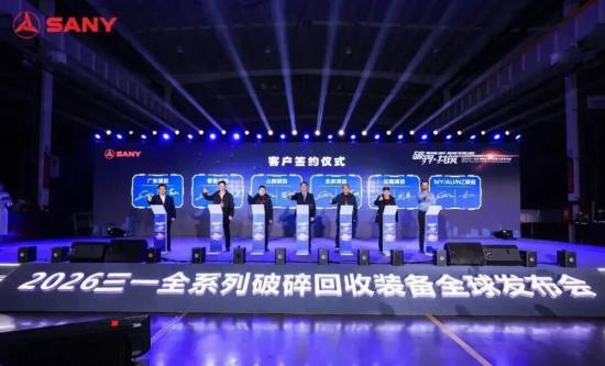 发布会尾声迎来合作高潮:三一筑工与中南大学签署产学研合作协议,双方将共建研发平台,加速技术成果转化。同时,一批重大海内外客户合作项目集中签约,标志着三一全系列破碎回收装备正式推向市场,全面融入全球绿色基建浪潮。