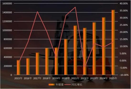 从2015年的327626台,到2025年的1451768台,10年间我国叉车销量增长343%!复合年均增长率达到16.05%。