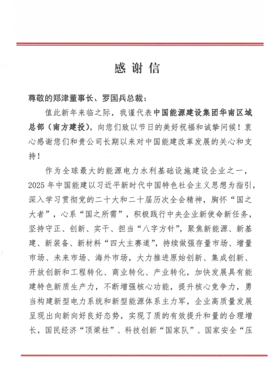 “真诚期待双方持续强化战略协同,不断拓宽合作领域……”1月21日,柳工收到一封沉甸甸的感谢信。这封感谢信来自中国能源建设集团华南区域总部(南方建投),字里行间满是双方并肩攻坚的深厚情谊,更印证了柳工作为“国之重器”助力重大项目建设的硬核底气。