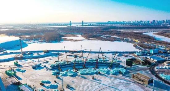 在这片零下几十度的天地里,二十余台徐工起重机昼夜不息,从25吨到200吨,钢铁巨臂在凛冽寒风中稳稳起落。它们吊起的,是一块块取自松花江的天然冰体,每块冰长1-1.6米,重达1至5吨,表面光滑,吊装精度要求极高。