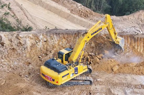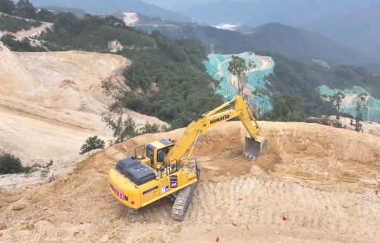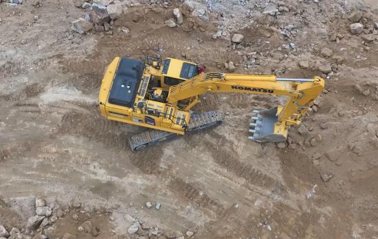 云涌千山动,尘浮机甲驰。广东云浮盛产石材,我们此行专门要考察小松挖掘机的作业效率。在不远处矿山上,一台崭新的小松PC395LC-11M0混合动力挖掘机正在沉稳有力地挖掘石料,每一个动作都透出从容的力量。