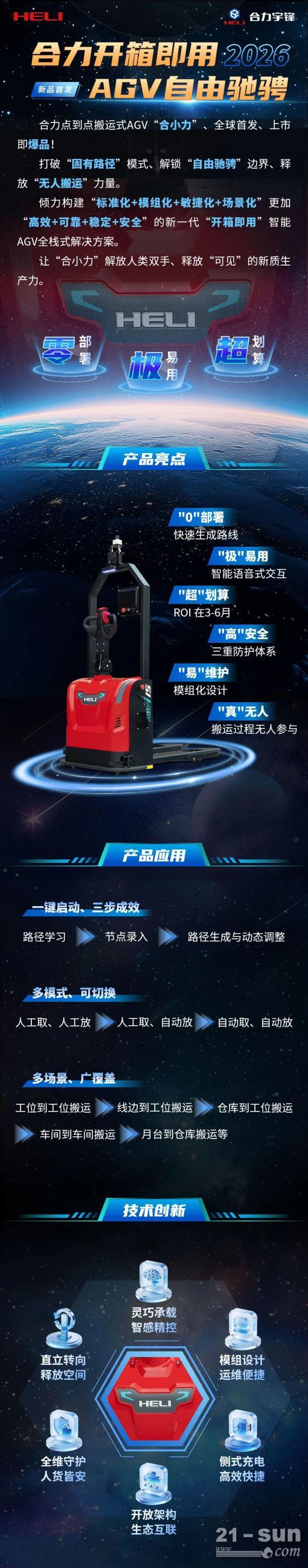 合力点到点搬运式AGV“合小力”、全球首发、上市即爆品!打破“固有路径”模式、解锁“自由驰骋”边界、释放 “无人搬运”力量。倾力构建“标准化+模组化+敏捷化+场景化”更加”高效+可靠+稳定+安全”的新一代 "开箱即用”智能AGV全栈式解决方案。让"合小力"解放人类双手、释放"可见"的新质生产力。