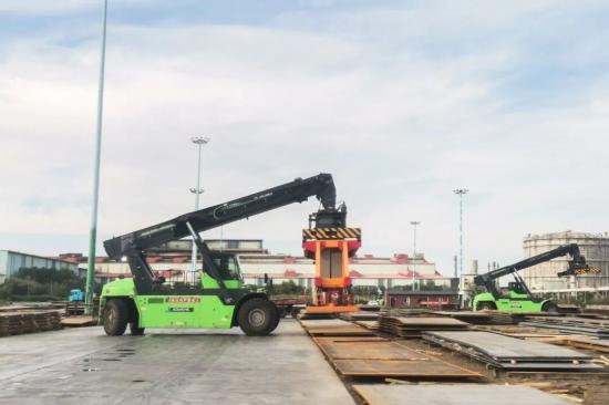 在西北某大型钢铁企业作业现场,规模化投入的徐工纯电动正面吊,配备专用电磁吊具,从容应对钢板与集装箱的混合装卸。