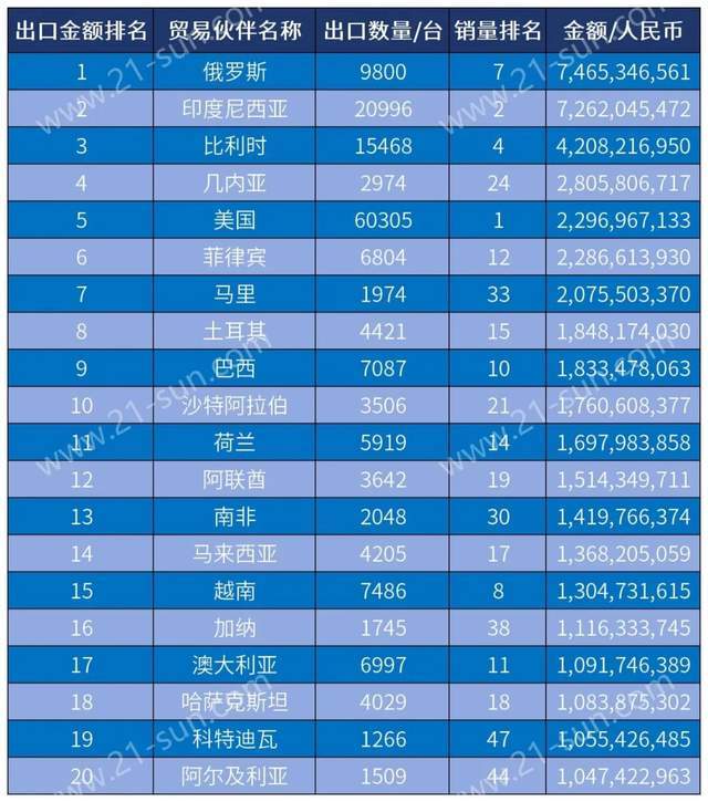 对印度尼西亚出口72.6亿元紧随其后,单台均价34.6万元,还不到俄罗斯的一半。
