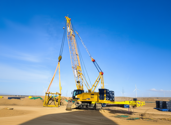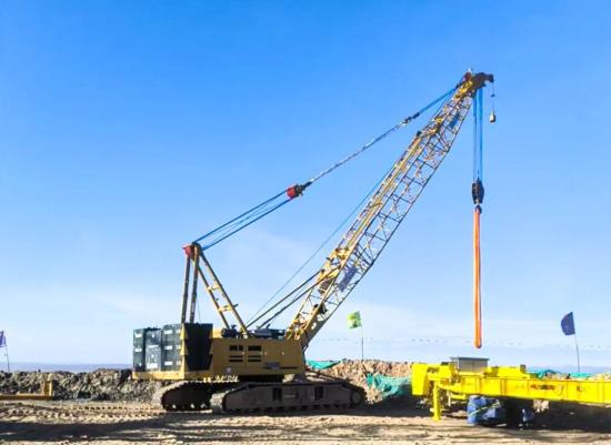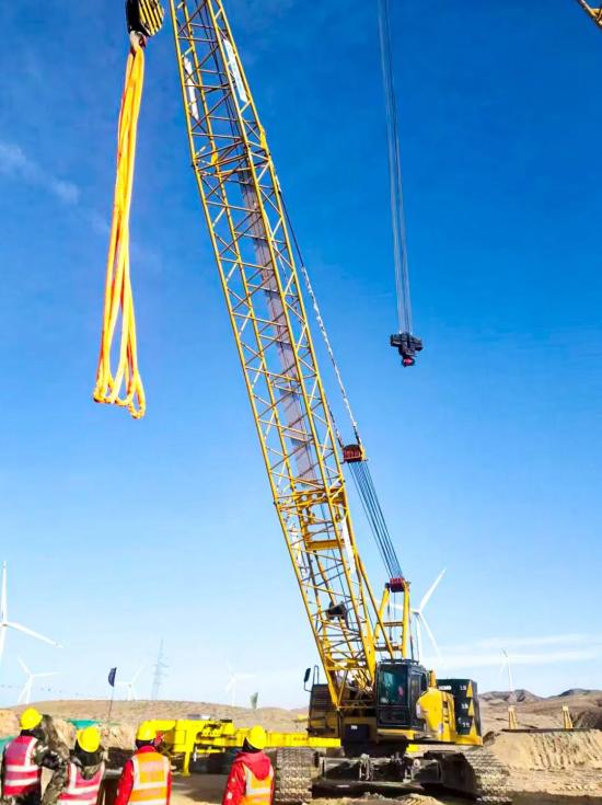 在宁夏山地风电场,XLC15000要吊起125米高的风机,第一步却得靠XGC100A(100吨级)履带起重机来“搭架子”。